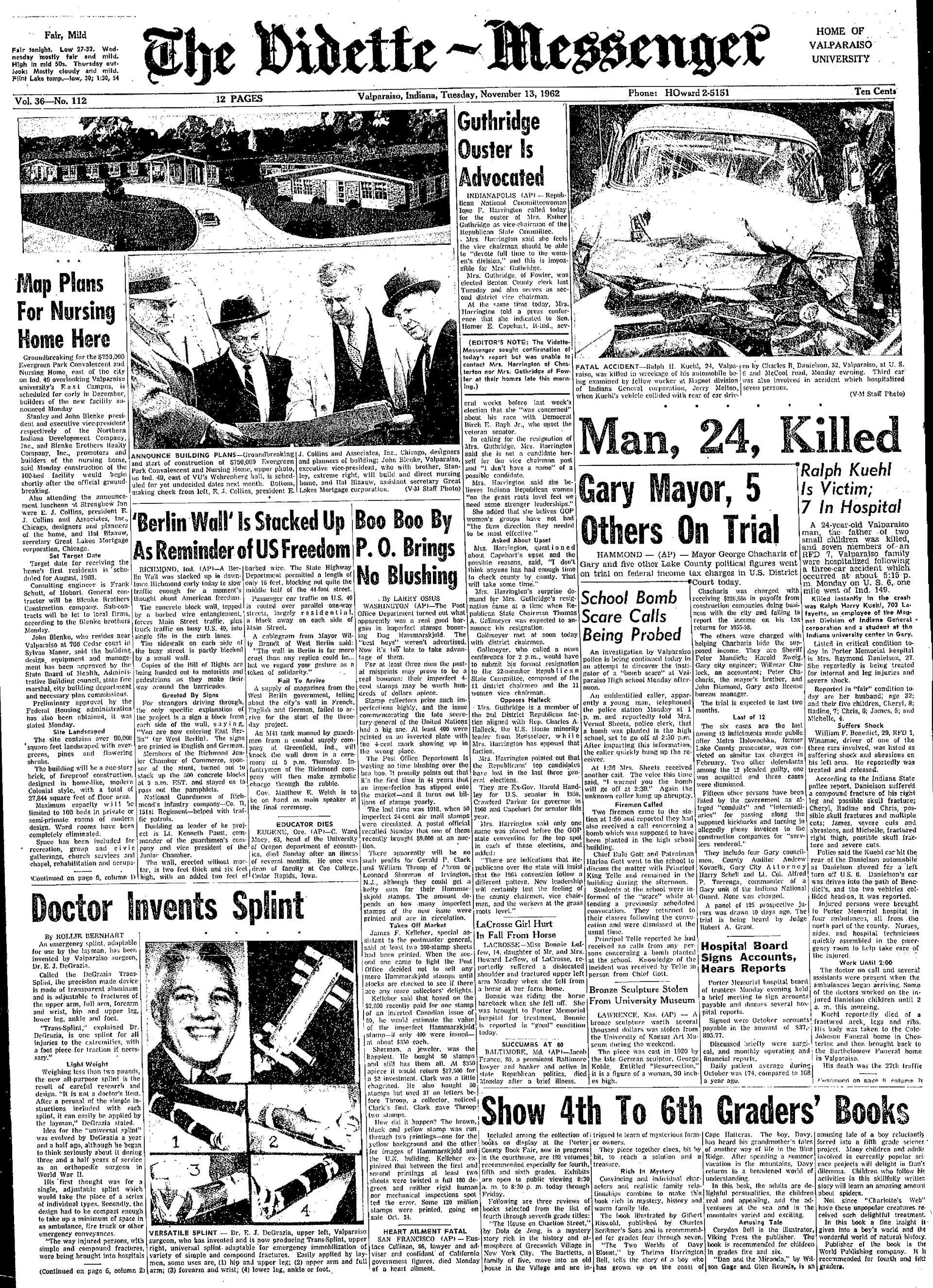 The Front Page of the Valparaiso Vidette-Messenger, from Tuesday, November 13th, 1962