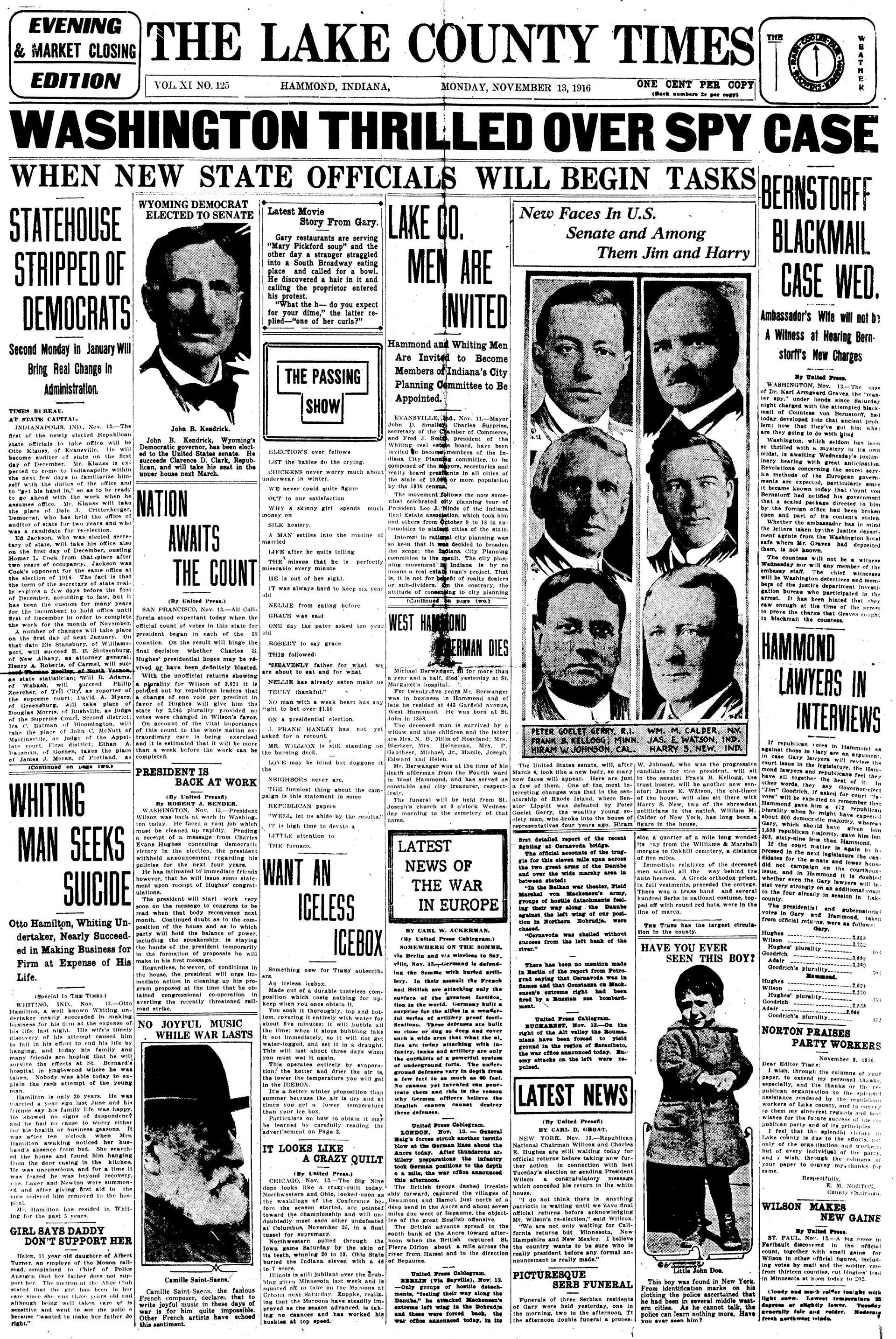 The Front Page of the Lake County Times from Monday, November 13th, 1916