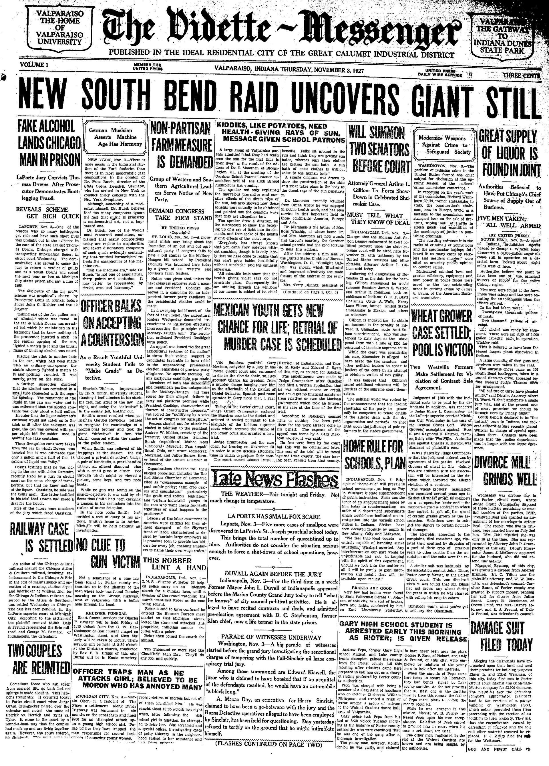 The Front Page of the Valparaiso Vidette Messenger, November 3rd, 1927