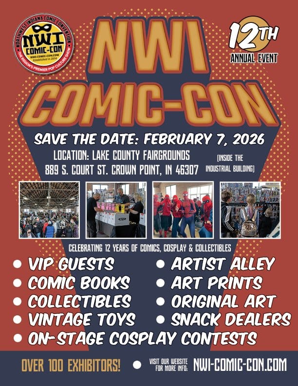 NWI Comic-Con is February 7th! A full-day of family friendly, affordable geek culture and comic book fun is right around the corner and you won’t want to miss it! Visit the Lake County Fairgrounds to take part in vendor booths, VIP guests, Artist Alley, Cosplay Contests, and even more. Find out more info right here.